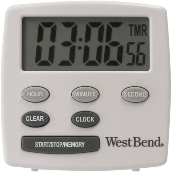 West Bend electronic LCD timer (counts to and from 100 hrs)this West Bend electronic timer counts to and from 100 hours. It has an easy to read LCD display and can recall the previous time setting. It has a continuous running clock that measures in hours, minutes and seconds. Model #: 40055 memory recalls previous time setting continuous running clock displays hours, minutes, and seconds am/ pm mode counts up to and from 100 hours Includes magnetic clip, back easel and hanging hole AAA battery included 460077